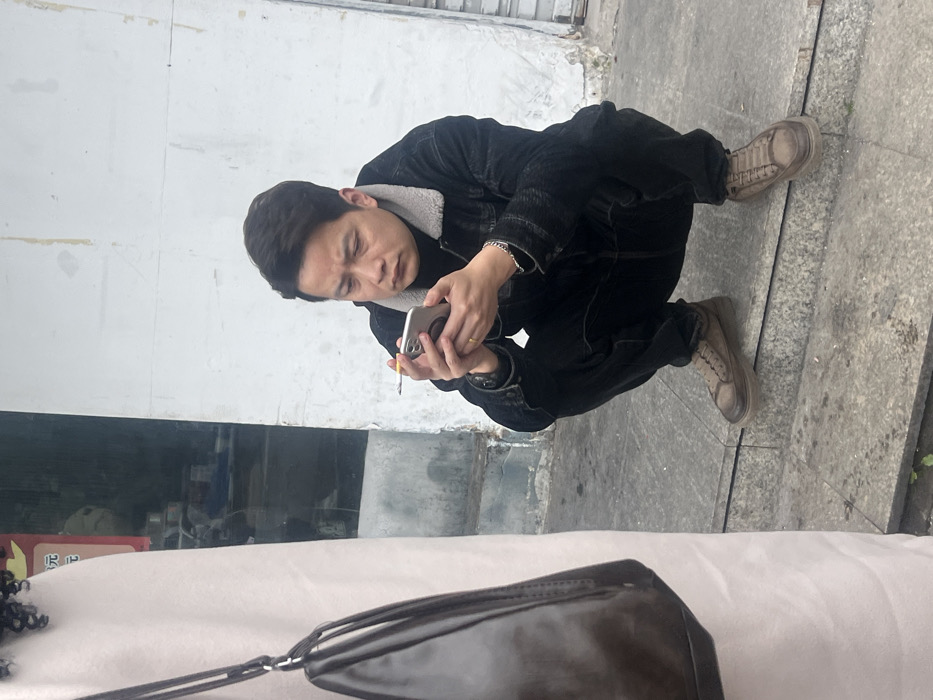 A man is squatting down on a sidewalk, focused on his phone. He's wearing a dark denim jacket with a light-colored collar, black pants, and tan boots. His pose suggests he's taking a photo or video. In the foreground, a black handbag with a strap is partially visible on a white surface. The background includes a white wall with a glimpse of a storefront window. The image is taken from a high angle.