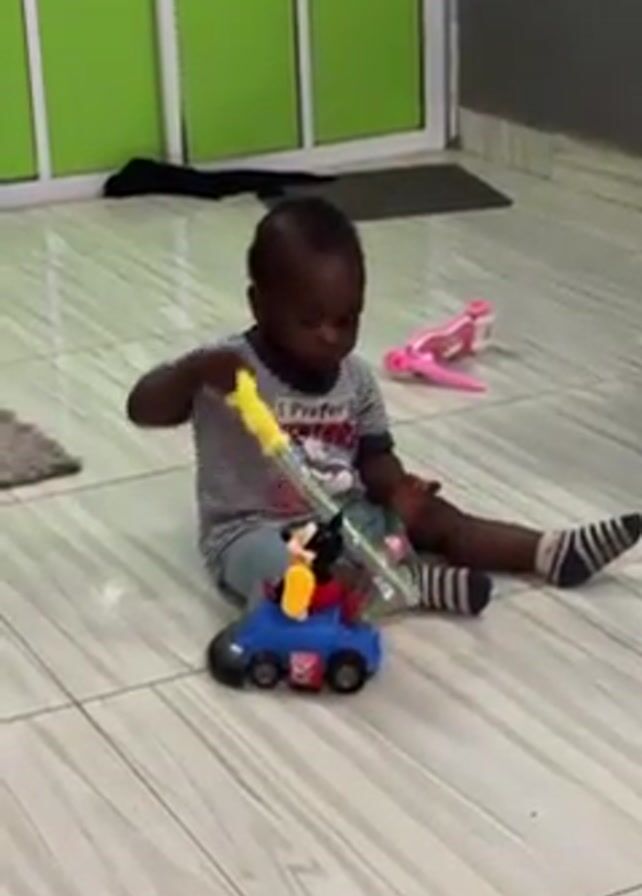 A young child with dark skin sits on a light-colored tiled floor, wearing a striped t-shirt and shorts. The child is using a yellow and clear bubble wand to try to interact with a blue and black toy car with Mickey Mouse figures. The car has red and pink lights. Behind the child, a white door with green panels is visible. Other toys, including a pink object, are scattered on the floor. There is also a small brown rug.