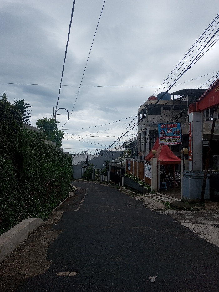 The image depicts an upward-sloping asphalt road in Ariyalai, Sri Lanka, under a heavily overcast sky. To the left, a steep embankment covered in dense green foliage rises alongside a low concrete retaining wall. A curved street light fixture, without a visible full pole, extends over the road from the left. To the right, a multi-story concrete building features an open-air ground level with a red pop-up canopy. Underneath the canopy, indistinct figures are seated around tables. A prominent blue banner on the building's second floor displays "STEAM 24," with additional text including "Cuci Karpet Berzin" and "OPEN" visible below. Numerous black power and communication cables crisscross overhead from the right. Further down the road, in the distance, a body of water or horizon line is visible beneath the cloudy sky. The dark asphalt road shows minor surface variations and a small white object near the bottom right. No specific actions or interactions are clearly discernible among the vague figures under the canopy.