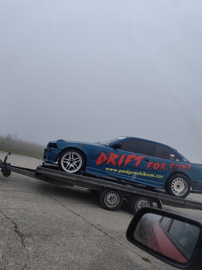 The image displays a teal blue BMW 3-series sedan, modified for drifting, loaded onto a two-axle car hauler. The vehicle features large red "DRIFT FOR FUN!" lettering on its side, with "www.podpravkikom.com" printed below it, and "Teama 1-50" near the front wheel well. The front wheels are multi-spoke silver alloy, while the rear wheels appear to be plain steel with a white rim. The car's front end shows signs of modification or damage, with the bumper possibly removed or incomplete. The scene is set on a paved surface, likely a road or track, under overcast or foggy conditions that obscure the distant background, where faint green terrain is visible to the left. In the bottom right foreground, a vehicle's side mirror reflects a portion of a red vehicle. There are no individuals visible in the frame. The location is in the city of Buhovtsi, Bulgaria.