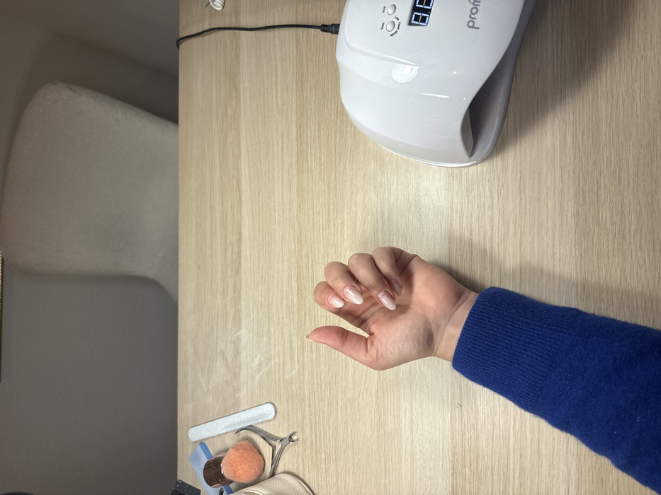 An indoor scene displays a person's left arm and hand resting on a light-colored wooden surface. The arm is covered by a royal blue, ribbed knit sweater. The visible hand has manicured fingernails, featuring a clear or light pink base with distinct white tips, consistent with a French manicure. To the left of the hand, an assortment of nail care tools is present, including a white nail file, a silver-toned cuticle nipper, a small brush with orange bristles, and a partial view of a light-colored pouch. To the right, a white UV/LED nail lamp with "prom" visible on its side sits on the table, displaying a digital reading of "88." A black power cord extends from the lamp towards the upper right corner. The background features a light-colored wall and the upper portion of an off-white, textured armchair. The specific location within Aix-en-Provence, France, is not discernible from the provided visual information.