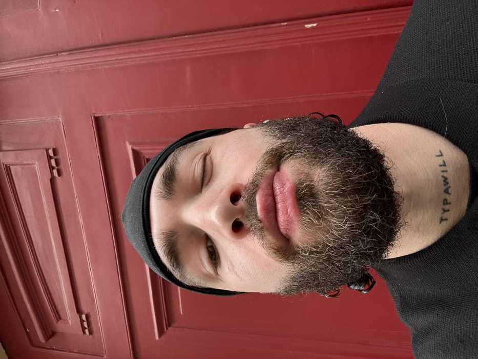 A close-up, head-and-shoulders selfie depicts a Caucasian male with a dark, full beard and mustache, wearing a black beanie and a black collared garment. His left eye is closed in a wink, while his right eye is open and directed towards the camera. His lips are slightly puckered. A small, silver-toned hoop earring is visible on his right ear (viewer's left), and a black coil-like earring or hair accessory is visible near his left ear (viewer's right). A tattoo reading "TYPAWILL" in lowercase letters is present on the front of his lower neck. The background is a deeply paneled, matte reddish-orange wooden door, featuring decorative architectural molding with small rectangular details, consistent with building entrance doors commonly found in Paris, France.