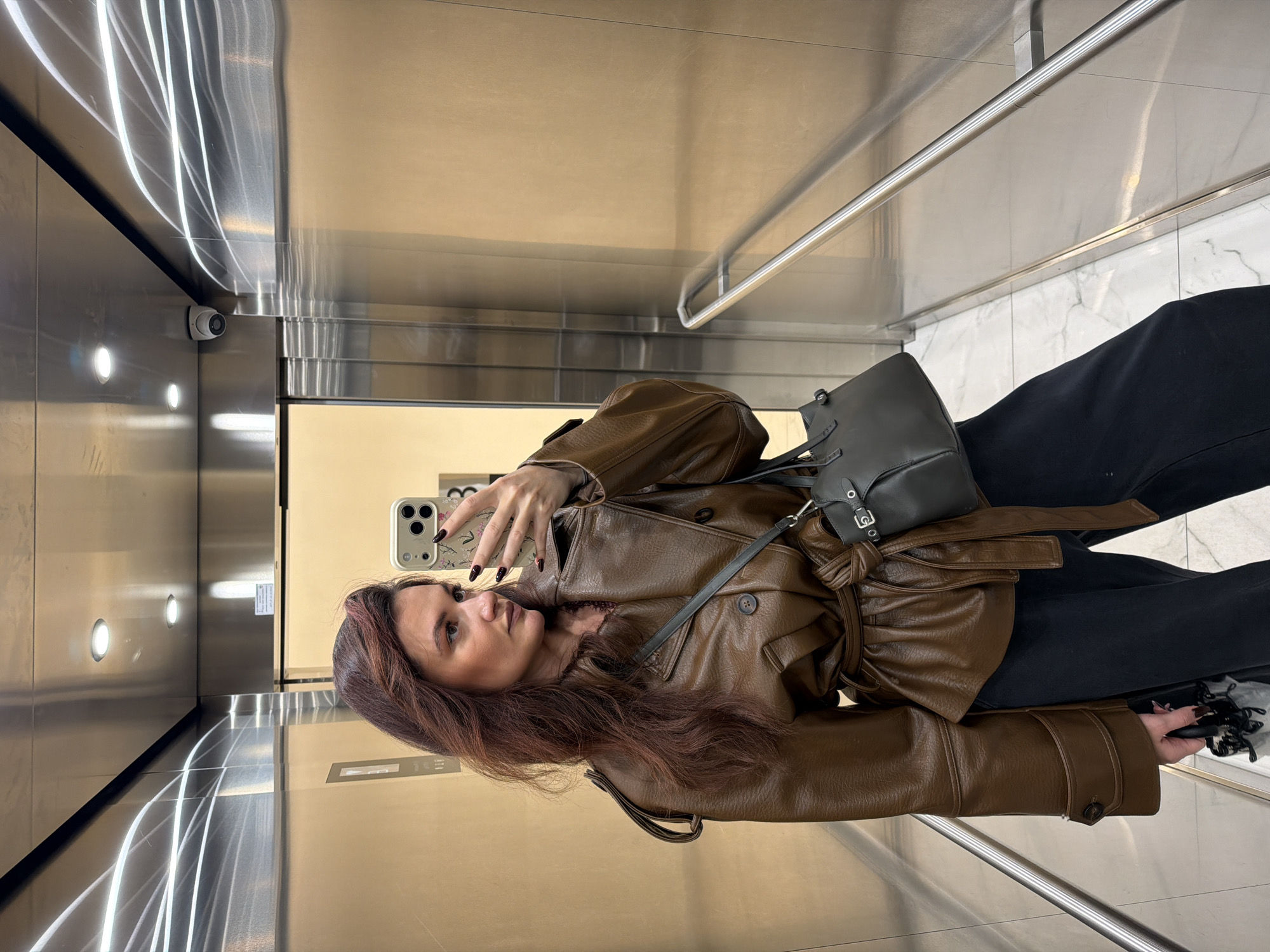A woman is taking a selfie in what appears to be an elevator, characterized by reflective stainless steel walls and marble flooring. A security camera is visible in the upper left corner of the elevator. The woman is wearing a brown leather jacket with a belt, black pants, and a dark gray handbag. She is holding a smartphone with a floral-patterned case. The location appears to be an upscale building or commercial space, potentially in Belgrade, Serbia.