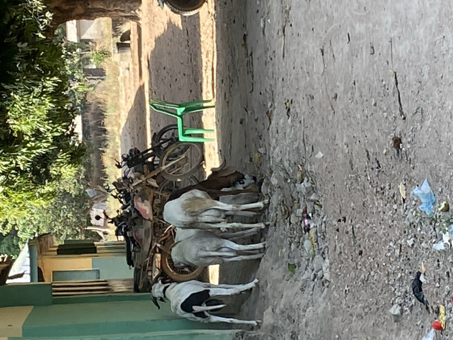 The scene, located in Zaki Biyem, Nigeria, depicts an outdoor area under clear daylight. In the lower-left foreground, four domesticated caprids, likely sheep or goats, are present. One animal, primarily white with black markings on its hindquarters, stands facing right. Three other animals, predominantly white and brown, are clustered, with one brown and white individual lowering its head towards the ground, appearing to forage. These animals are positioned on a dirt surface next to a light-green painted building. Approximately four motorcycles are parked alongside the building, immediately behind the animals. To the right of the motorcycles, a single, unoccupied bright green plastic chair stands upright on the dirt ground. The ground across the visible area is composed of dry dirt and gravel, with various pieces of scattered litter, including plastic bags and other debris, particularly in the immediate vicinity of the foraging animals. The background features sparse, dry vegetation, a large tree with green foliage on the right, and indistinct distant structures under a bright sky.