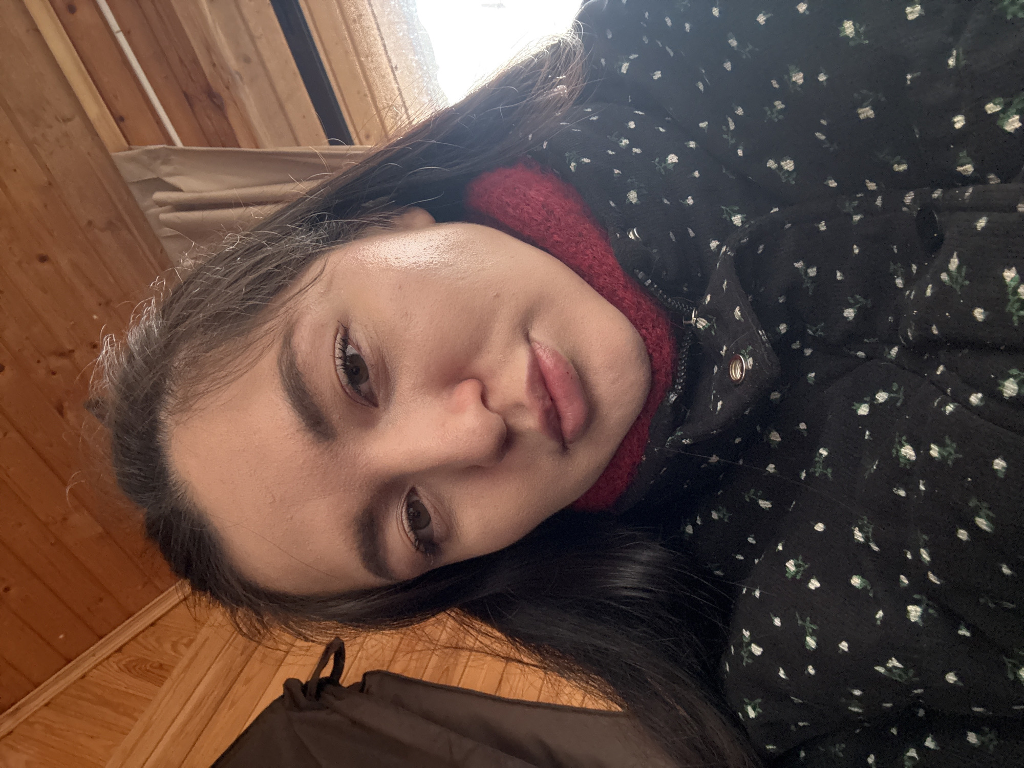 A close-up portrait photograph taken in an indoor setting within the city of Kurovskoye, Russia, features an adult female. The individual has long, dark brown hair and a fair complexion, with dark brown eyes looking directly into the camera. She is wearing a black jacket with a white and green small floral pattern, under which a textured, red knitted turtleneck or high collar is visible. The jacket exhibits a metal zipper pull and a visible snap button near the collar. The background primarily consists of light-toned wooden paneling on the walls and ceiling. In the upper left, a dark brown curtain or fabric hangs. To the right, a lighter, possibly beige, curtain is partially drawn, alongside a blurred window section featuring a horizontal white bar, suggesting an obscured exterior view or frosted glass. The lighting is soft, illuminating the subject predominantly from the right side of the frame. No discernible interactions or specific actions beyond posing for the photograph are evident.