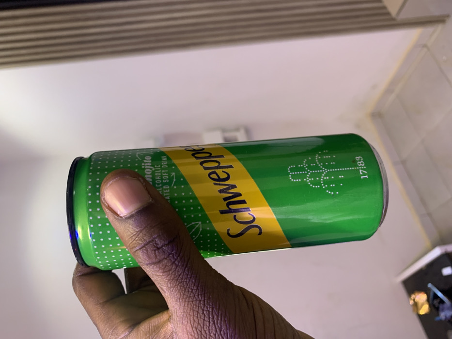 An individual's dark-skinned hand grasps a green Schweppes Mojito non-alcoholic carbonated soft drink can in an indoor setting in Gura Top, Nigeria