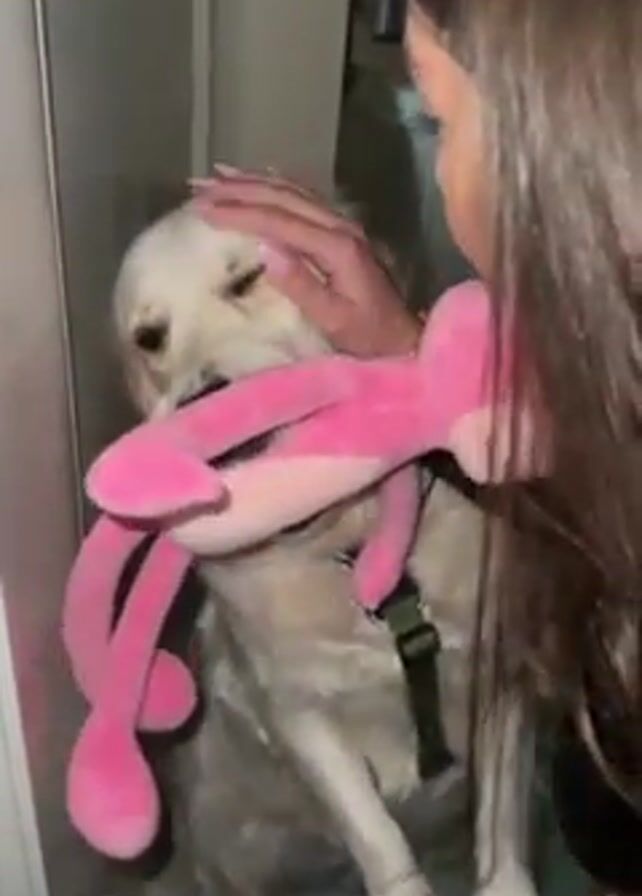 white golden retriever dog holding a plush pink panther toy in its mouth