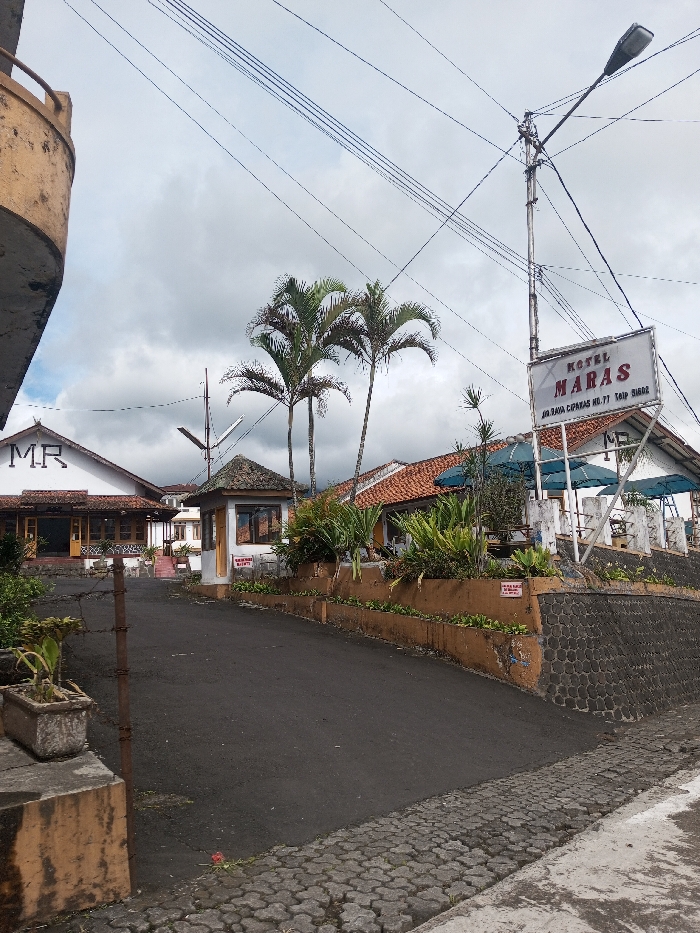 The image displays an exterior view of the Hotel Maras property in Cisarua, Indonesia, under an overcast sky