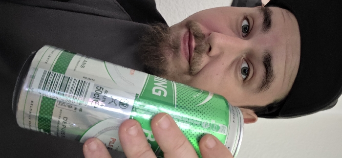 A close-up, chest-up vertical photograph captures a male subject in what is identified as the city of Käerjeng, Luxembourg. The male, appearing in his late 20s to early 30s, has light-colored eyes, a dark mustache, and a goatee-style beard. He wears a black baseball cap facing backward and a dark grey shirt. The subject holds a silver and green Bofferding Pilsner beer can, labeled "Alc 4.8% Vol 50cl e", in his right hand, presenting it towards the camera. The background consists of a plain white wall.