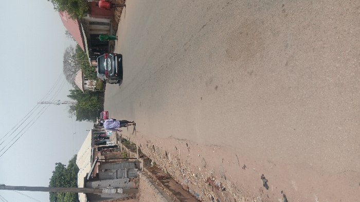 The image depicts a street scene in Jos, Nigeria, during daylight hours under a bright, hazy sky. The central feature is a two-lane asphalt road, appearing dry and showing minor wear, which recedes into the distance. On the left side of the road, a dirt and gravel shoulder borders an open concrete drainage ditch containing debris. Beyond this ditch, a row of single-story structures with corrugated metal roofs, likely shops or residences, extends along the street. A prominent wooden utility pole stands in the foreground on the left. Several individuals are visible near these structures. On the right side of the road, another unpaved shoulder abuts a building with a red corrugated metal roof. Further down the street on this side, a multi-story building with a light-colored exterior and a conical roof is partially visible through trees. Three male subjects are walking on or near the road, facing away from the camera. One, wearing a light blue long-sleeved shirt and dark shorts, walks in the left lane. Another, in a green garment, walks on the right shoulder. A third, in a red top, walks further right, partially obscured. Two vehicles are present: a dark grey SUV is driving towards the viewer in the right lane, while a red sedan is driving away from the viewer in the distance in the left lane. Overhead, multiple utility lines traverse the sky, and a tall metal lattice tower, likely a telecommunications mast, is visible in the far distance on the left side, behind the buildings. Scattered trees and foliage are present throughout the scene.