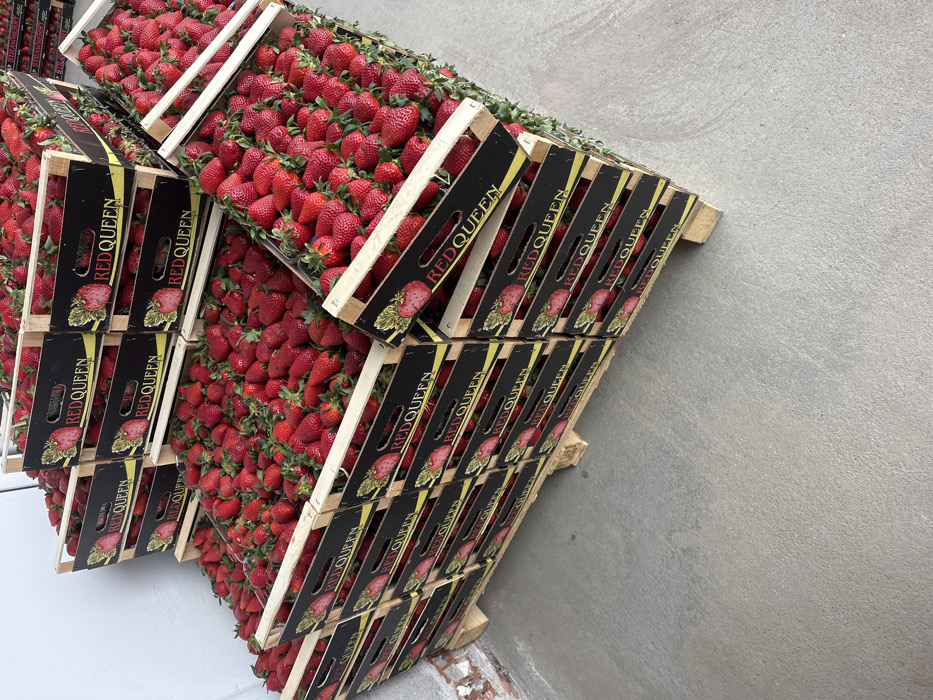 A large quantity of fresh strawberries is displayed in a storage area in Plodovitovo, Bulgaria. Numerous wooden crates, each featuring a black label with "REDQUEEN" branding and a strawberry graphic, are stacked multiple layers high on at least two light-colored wooden pallets. The crates are filled with bright red, ripe strawberries, many of which retain their green calyxes. The environment consists of a light grey concrete floor in the foreground and a plain, light-colored wall with some visible rough brickwork at its base on the left side of the frame. No individuals are present in the scene.