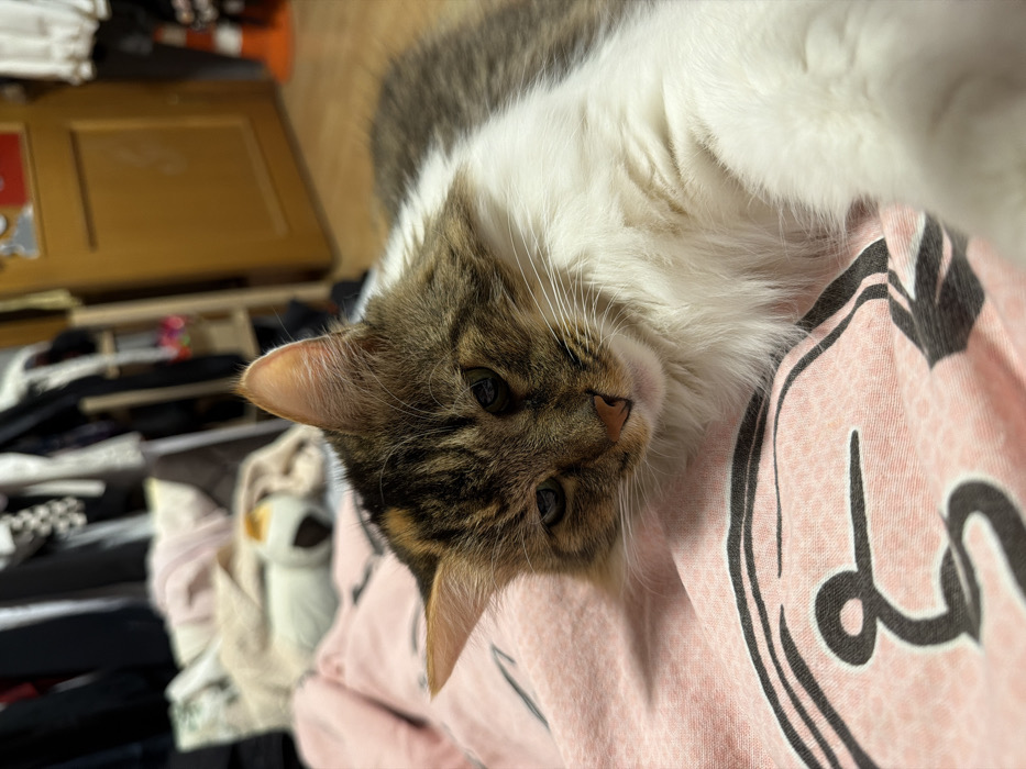 - "A long-haired domestic cat, exhibiting a tabby pattern of brown and black stripes on its head and back, with substantial white fur on its chest, belly, and front paws, is depicted lying on a pink patterned fabric" by FM-3WDDJ2, licensed under CC BY 4.0