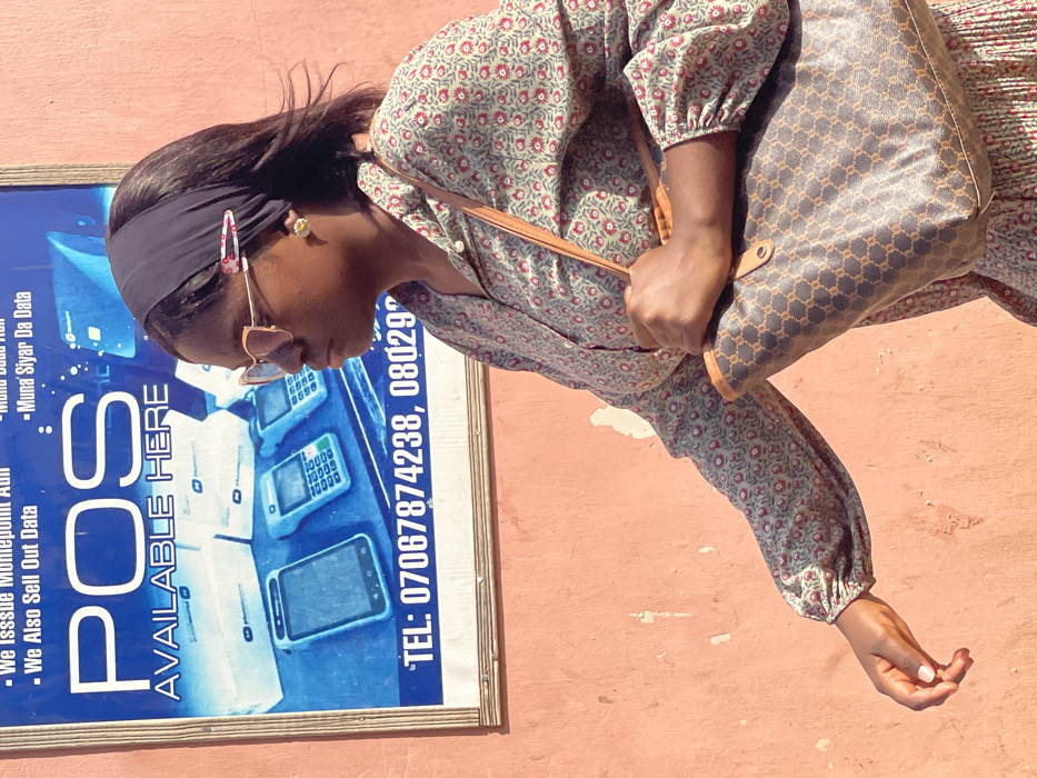 An image captured in Samaru, Nigeria, depicts a dark-complexioned woman in profile, facing right. She wears a dark headscarf, light brown-rimmed eyeglasses, a white and red patterned hair clip, and a light-colored flower-shaped earring. Her attire is a long-sleeved, collared patterned dress featuring small red floral and green leaf motifs on a light olive background. She carries a brown, geometrically patterned tote bag with light brown straps, held by her right hand. Her left arm extends forward and downward. The background consists of a peeling, reddish-orange stucco wall. Mounted on this wall is a rectangular blue sign with a white border, advertising "POS AVAILABLE HERE." The sign displays images of three distinct point-of-sale devices and lists services including Moniepoint issuance and data sales (including "Muna Siyar Da Data" in Hausa), alongside partial telephone numbers: "07067874238, 08029...".