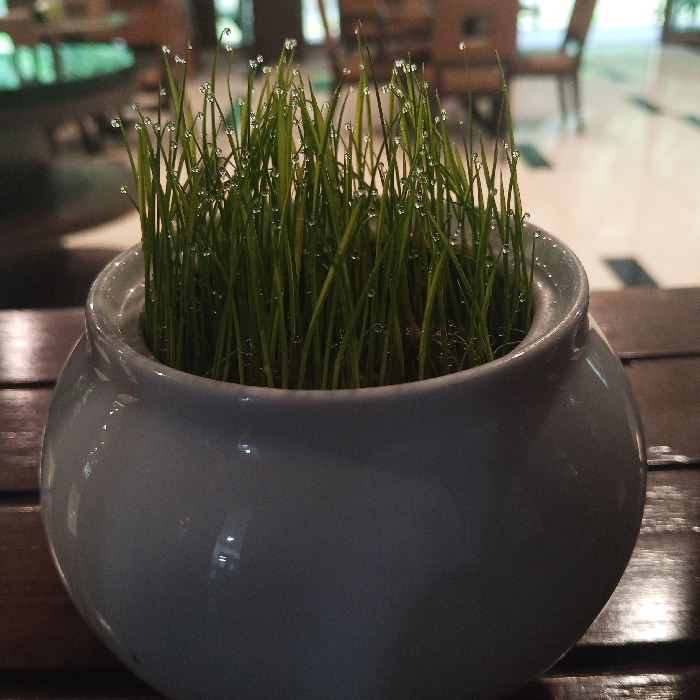 - "A light grey, spherical ceramic pot containing vibrant green grass is centered in the foreground, positioned on a dark, horizontally slatted wooden surface" by FM-31wQG2, licensed under CC BY 4.0