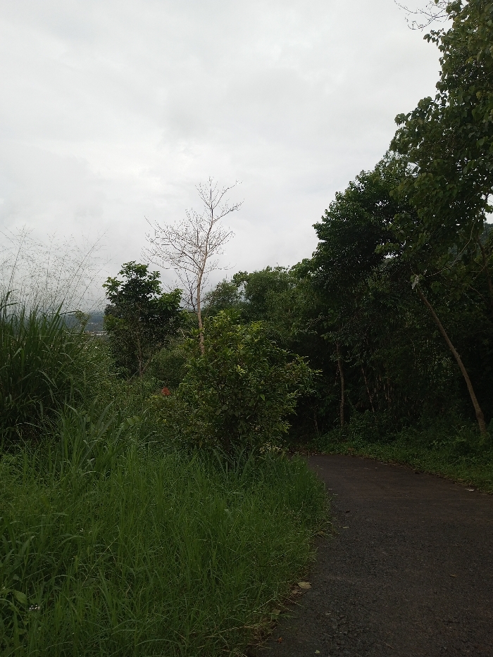 The scene is an unpopulated outdoor landscape in Ambakirano, Madagascar, under an overcast sky. A dark, unpaved road enters from the bottom right and curves to the left into the midground. The road is flanked on the left by dense, tall green grass and on the right by a mix of dark green trees and bushes. A leafless deciduous tree with pale bark and branches stands centrally in the midground, surrounded by verdant foliage. Further back, a dense forest canopy with dark green leaves dominates the right and central background. Distant, indistinct landforms or structures are visible through a slight atmospheric haze in the far background. No people or animals are present.