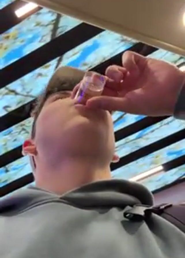 A young man in a light blue hoodie and baseball cap is drinking from a small plastic cup. He tilts his head back and another hand helps position the cup. The camera is a low-angle shot looking up at the man. The background features a modern ceiling design with linear black elements and a panel that appears to display a blue, cloud-like image.