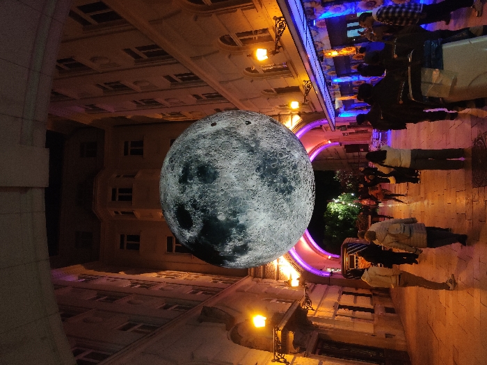 The image depicts a nighttime scene within a pedestrian passage of Gozsdu Udvar, located in the 7th district of Budapest, Hungary. A large, spherical replica of the Moon, accurately detailed with craters and maria, dominates the upper-center frame, appearing suspended above the street. The passage is flanked by multi-story, classically styled buildings, approximately four to five stories tall, featuring numerous rectangular windows and some decorative cornices. Warm, yellow-orange streetlights affixed to the building facades illuminate the cobblestone or patterned paved ground. On the right side, a commercial establishment, likely a bar or restaurant, displays prominent blue and purple neon lighting and colorful artistic decor on its exterior. Further down the passage, a large archway is visible, brightly lit with purple and pink uplighting, leading to another section of the complex. Approximately fifteen to twenty individuals are present in the passage. Most are adults, dressed in casual evening attire such as jackets, hoodies, and jeans. Several people are walking towards or away from the viewer, while others are standing, seemingly observing the large Moon installation. Some individuals are visible near the commercial establishment on the right. In the lower right foreground, a white, rectangular object, possibly a mobile cart or cooler, is partially visible. The sky above the buildings is dark, indicating a clear night.