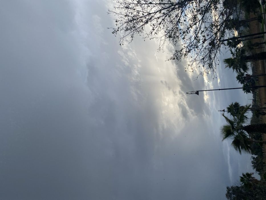 The image captures an outdoor scene in Mechouar Fes Jdid, Morocco, under an overcast sky dominated by gray cloud formations. A brighter, partially illuminated section with visible light rays is present in the upper right quadrant. Multiple small, dark avian figures are discernible against the sky in the upper left. In the lower half of the frame, several palm trees with dark green fronds are visible, primarily on the left and center-left. A tall, dark streetlight pole with a curved arm and lamp fixture stands in the mid-ground, slightly left of center, with a small bird perched on its top. Another identical streetlight is visible further back to the left. To the far right, a large tree with dark, bare branches extends into the frame, silhouetted against the sky. A low, textured wall structure, appearing to be made of stone or earth, spans the mid-distance horizontally behind the trees. No human subjects are present in the scene.