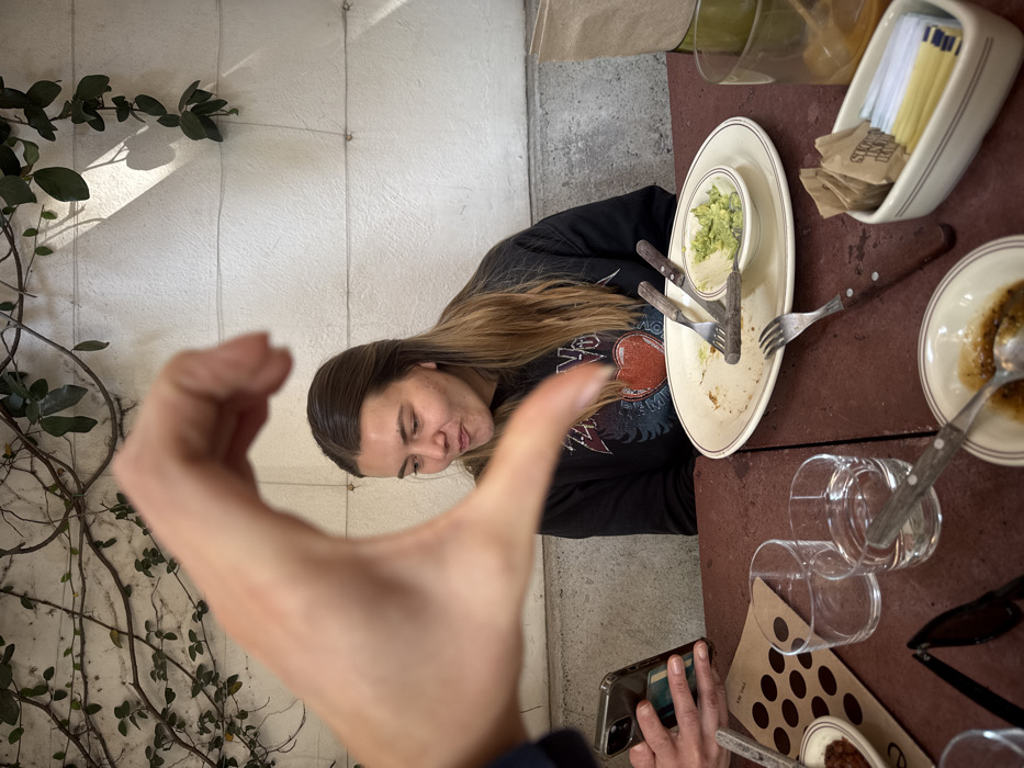 A woman with long brown hair sits at a table with a plate of guacamole and utensils. A hand in the foreground makes a circle gesture. A smartphone is visible near another hand. The table is set with plates, glasses, and a utensil holder. A wall with climbing vines is in the background.
