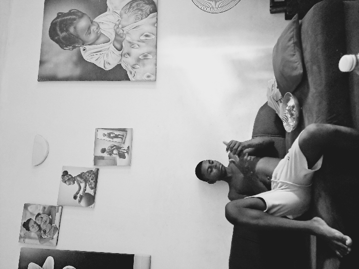 A black and white photograph depicts an indoor scene in a residence in Ado, Nigeria. A shirtless male, appearing adolescent, wearing white shorts, is seated on a dark-colored couch. His bare feet are visible, and his left leg is extended. He is looking down, engaging with a small object held between his clasped hands, likely a smartphone. To his right on the couch, a bowl containing food and a utensil rests next to a dark pillow. The white wall behind him is adorned with several artworks: a large canvas on the right displays a baby, while a cluster of three smaller canvases on the left depict a woman holding a baby, a child with a pot, and a child viewing their reflection in a mirror. A semicircular wall-mounted light fixture is positioned above the smaller artworks. A portion of a stand fan is visible on the far right, and a capped bottle is on a surface in the lower right foreground.