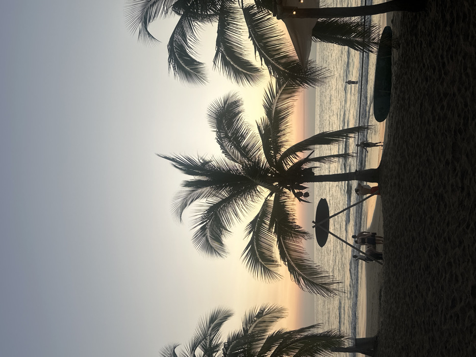 A serene beach scene unfolds with palm trees silhouetted against a sunset-hued sky