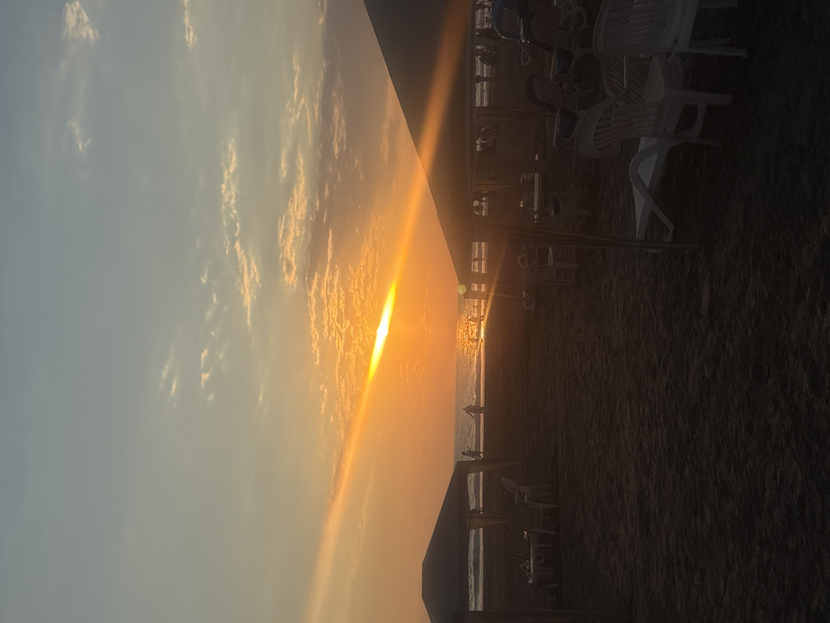 A serene beach scene unfolds at sunset. The horizon, marked by the sun's fiery kiss on the water, sets the sky ablaze in hues of orange and gold, contrasting with the fading blue. Silhouettes of people dot the shoreline near the ocean. A beachside café with stacked white chairs and tables stands nearby, partially obscured by the darkness of the sand.