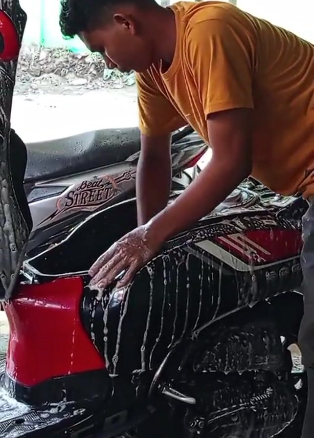 A young man is shown washing a black and red Honda scooter. The scooter is covered in soapy water. He is wearing an orange t-shirt and grey pants, and uses a cloth to scrub the scooter. Another scooter is parked behind the one being washed. A bucket of water is visible on the ground. The background features a green fence.