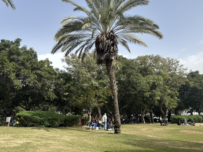 A wide-angle outdoor photograph depicts a bustling park scene in HaYarkon Park, Tel-Aviv, Israel, under a partly cloudy light blue sky
