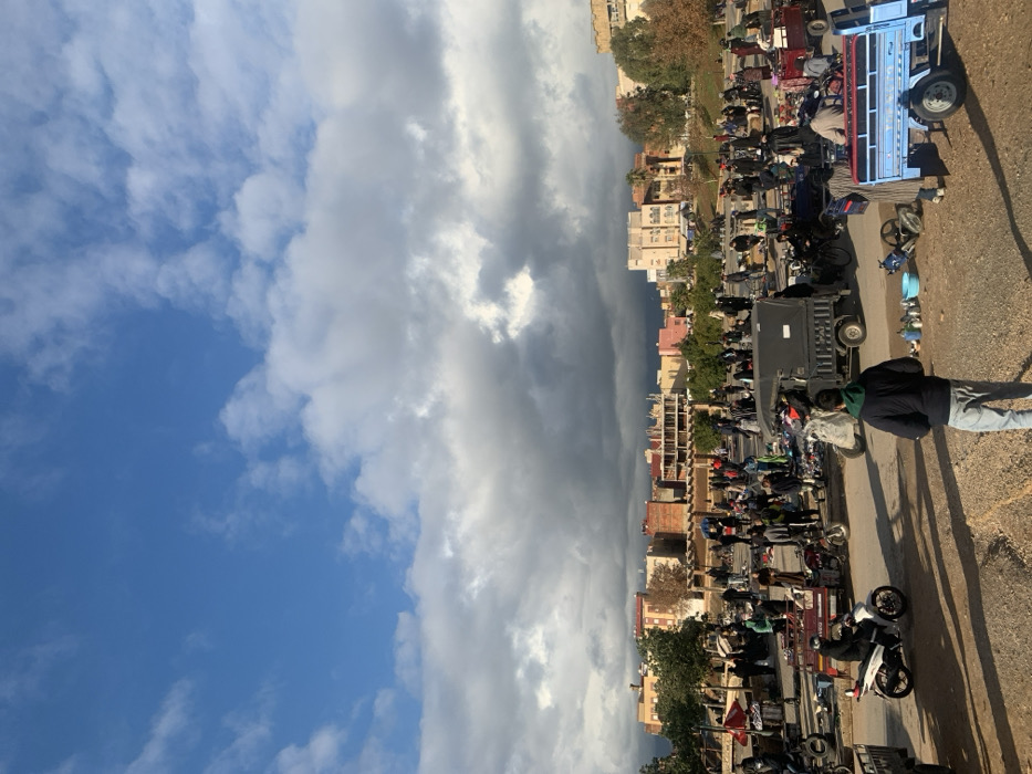 This image depicts an expansive outdoor market scene in Ouislane, Morocco, under a partially cloudy sky