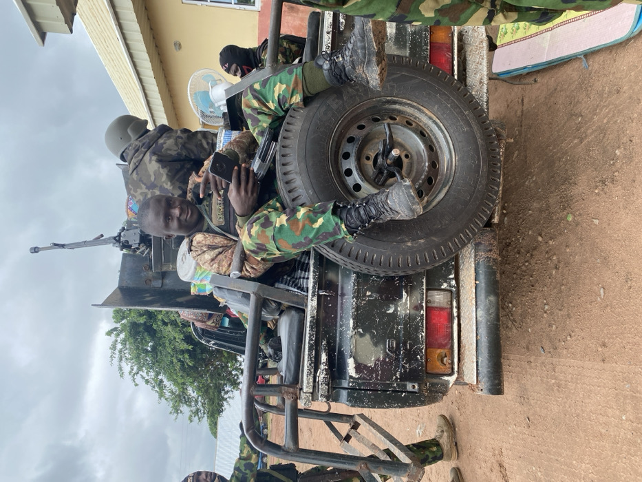 The image depicts a group of military personnel with a modified pickup truck on a dirt road in Kado, Nigeria, under an overcast sky