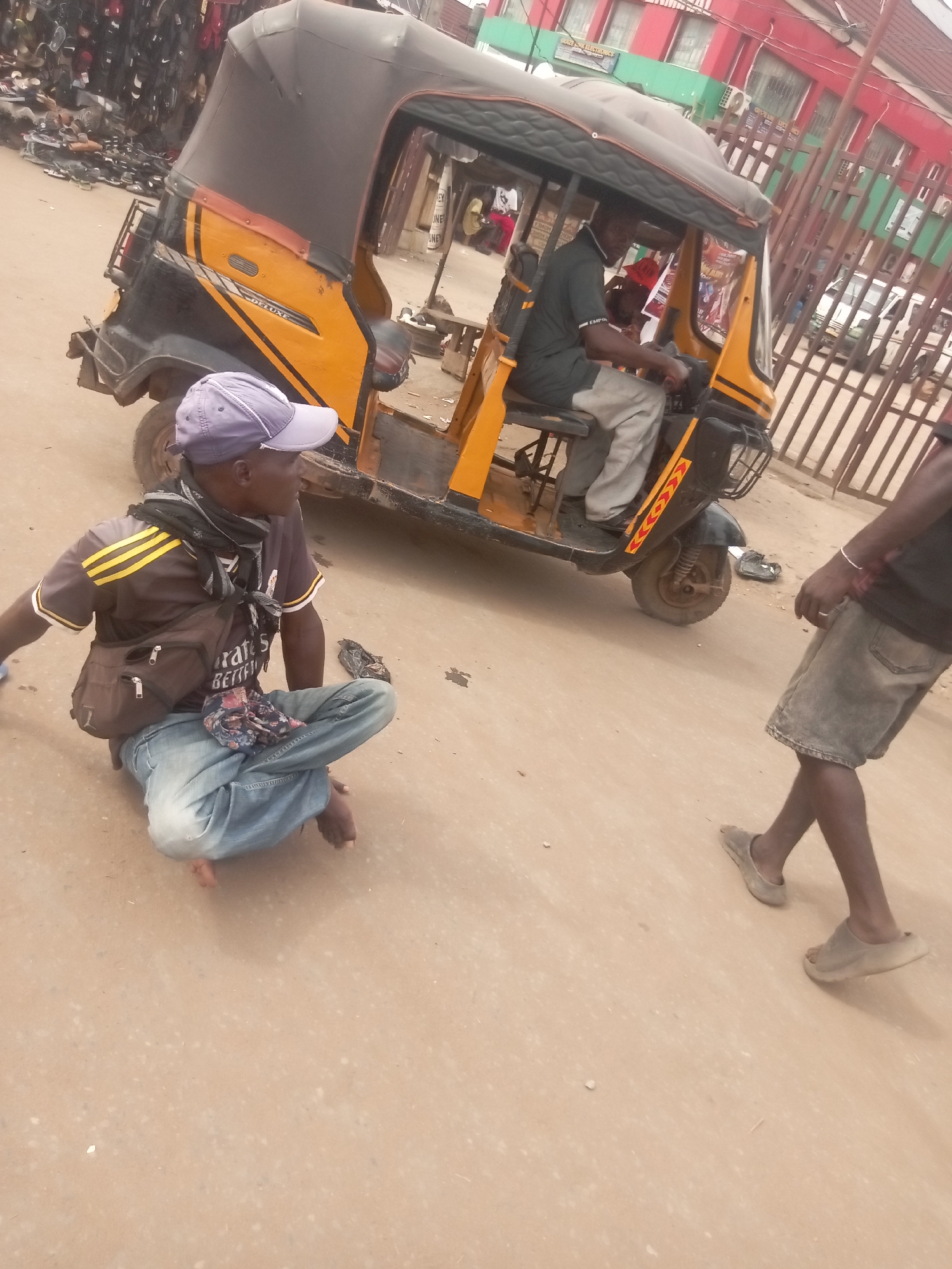 The image captures a street scene in Onitsha, Nigeria. A barefoot man wearing a purple baseball cap, a brown and yellow shirt, blue jeans, and a messenger bag sits cross-legged on the ground, looking towards a yellow and black tricycle taxi (keke). The keke, which is occupied by a driver and at least one passenger, is in the middle of the street. A man in denim shorts and sandals walks by the keke on the right. The ground is sandy. In the background are shops with their merchandise spread on the walkway. A metal fence separates the street from the building.