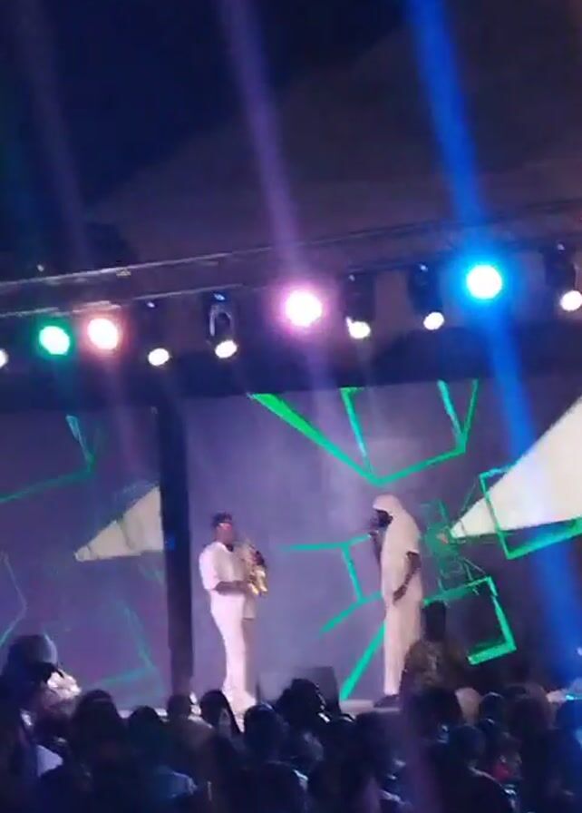 On a stage brightly lit with white, blue, and pink lights, two men dressed in white are performing in front of a crowd. The man on the left plays a saxophone, while the man on the right holds a microphone and appears to be singing or rapping. Behind them is a large screen displaying dynamic green and white geometric patterns. The crowd is visible in the foreground.