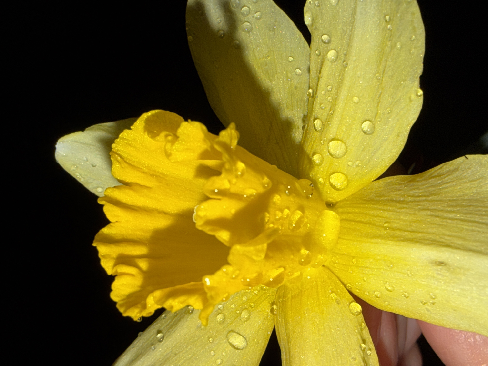 A close-up image shows a vibrant yellow daffodil flower against a black background. The flower is covered in water droplets, enhancing its texture and form. A hand partially enters the frame at the bottom right. The scene is likely staged or photographed indoors due to the black background and controlled lighting. Given the request to include the location of Beryozovy, Russia, one can infer that the subject or photographer might be in or connected to that location, although there is no visual evidence of it.