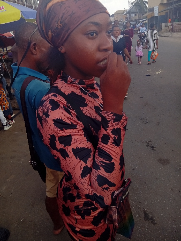In an outdoor setting, a person wearing a brown headscarf and a fitted, reddish-brown dress with black spots stands near others on a paved surface that appears to be a street. The individual's hand is near their mouth. Other people, including a child in a pink dress, can be seen in the background walking down the street. A man wearing a blue shirt is standing to the side. There are also buildings and a blue and yellow canopy in the background.