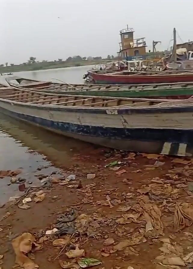 body of water with several boats docked along the shore. The boats appear to be wooden and of various sizes. The shoreline is covered with trash and debris. In the background, there is a tugboat or small vessel with a tower. The sky is overcast and the overall scene is somewhat bleak. The camera angle is slightly unsteady, suggesting handheld filming. There is also a fleeting glimpse of someone, perhaps the cameraperson, partially obscuring the view at the beginning of the video.