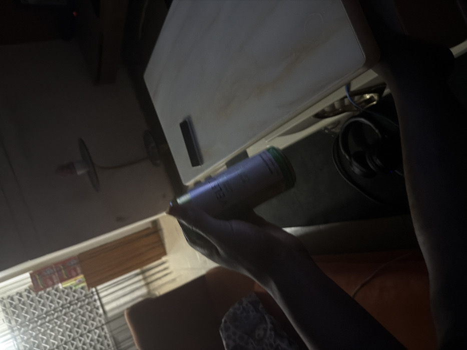The image depicts a dimly lit indoor scene, presumably within a residence in Ogbomosho, Nigeria. In the immediate foreground, a human left arm and hand are observed holding a light-colored metallic can, potentially a beverage, with the partial brand name "VELITA" visible and a green base. The individual appears to be seated in a brown or orange upholstered armchair, with a patterned fabric draped over a portion of the chair. To the right, a rectangular table with a light-colored surface (possibly wood or laminate) is present. A dark, rectangular object, resembling a remote control or a small electronic device, rests on its surface. Below the table, a pair of black over-ear headphones is visible. In the background, a wall features a geometric patterned design, possibly ventilation blocks or a decorative screen. Adjacent to this wall, a multi-tiered wooden cabinet is visible, with stacked items on its upper surface, potentially packaged food products. Further right, a small, slender pedestal table holds a light-colored, conical object. The overall lighting is low, suggesting an interior setting with limited illumination.