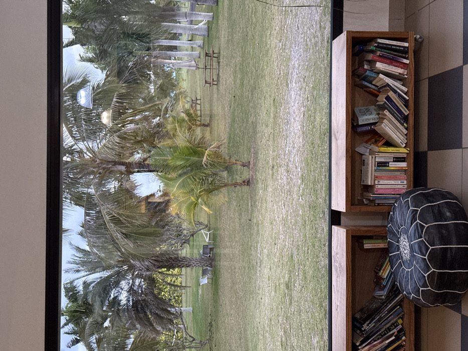 This image presents an interior perspective looking out through a large, dark-framed window onto an outdoor recreational area, identified as being in Bourail, France. In the immediate foreground, a black and white checkered tiled floor is visible. Centrally positioned on this floor is a dark grey or black leather pouf, featuring a distinct stitched hexagonal pattern on its surface. To the left and right of the pouf, two open-faced bookshelves constructed from light-toned wood are present. These shelves, resting on small wheels, are horizontally oriented and each contains numerous books, some standing upright and others leaning. Beyond the window, the outdoor environment consists of an expansive, mown green lawn. Various palm trees, differing in height and species, are sparsely distributed across this grassy area. On the left side of the lawn, four light-colored outdoor chairs are arranged informally beneath a large palm tree. Towards the right side of the lawn, a wooden picnic table with attached benches is situated near a folded white beach umbrella. Further in the background on the right, multiple hammocks are visible, suspended between the trunks of palm trees. The sky above is overcast. Reflections of two domed, metallic light fixtures, originating from the interior space, are discernable in the upper portion of the window glass, superimposed over the outdoor foliage. No individuals are depicted within the scene.