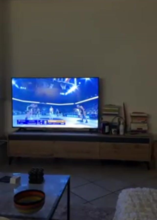 n indoor shot of a living room. In the background, a television displays a basketball game. The TV is placed on a long, low wooden cabinet, and several books are stacked on the right side of the cabinet. In the foreground, there is a glass-topped coffee table with a few decorative items. The camera focuses on a person petting a cat, which is mostly white with some brown markings. The cat's eyes are closed as it is being petted.
