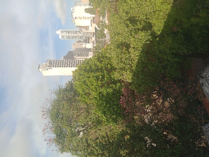 An aerial perspective image captured in the city of Lomas de Zamora, Argentina, displays a predominantly green urban landscape under a clear sky with scattered white clouds. The foreground features the upper edge of a dark, textured rooftop or structure, partially visible at the bottom left. The midground is dominated by a dense canopy of varied trees, primarily bright green, with one prominent tree in the left-center exhibiting reddish-pink foliage or blossoms. These trees largely obscure the ground level and lower structures. In the background, an urban skyline is visible, characterized by multiple high-rise buildings. The most prominent is a tall, slender white skyscraper with a distinctive multi-tiered top structure, located slightly left of the image's vertical center. Other lighter-colored high-rises and smaller buildings are visible to its right and behind it, indicating a built-up area beyond the tree line. No individuals or discernible actions are depicted.