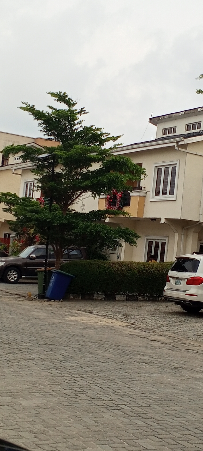 A multi-story beige house with white window trim is partially obscured by a large green tree and a trimmed hedge. A dark SUV is parked to the left, and a white SUV is parked to the right. Two trash cans, one green and one blue, are near the hedge. The street is paved with gray bricks, and the sky is overcast. A wreath hangs on a balcony.