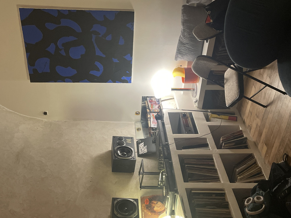 A room features a textured wall with two speakers and a black and blue abstract painting. Adjacent is a built-in white shelving unit filled with vinyl records. On top sits a turntable, radio, and other items. Two gray folding chairs are near a small round table with a lamp. A gray sofa sits to the side. A black bag with white cartoon eyes is on the floor. The room is illuminated with a soft, warm light.
