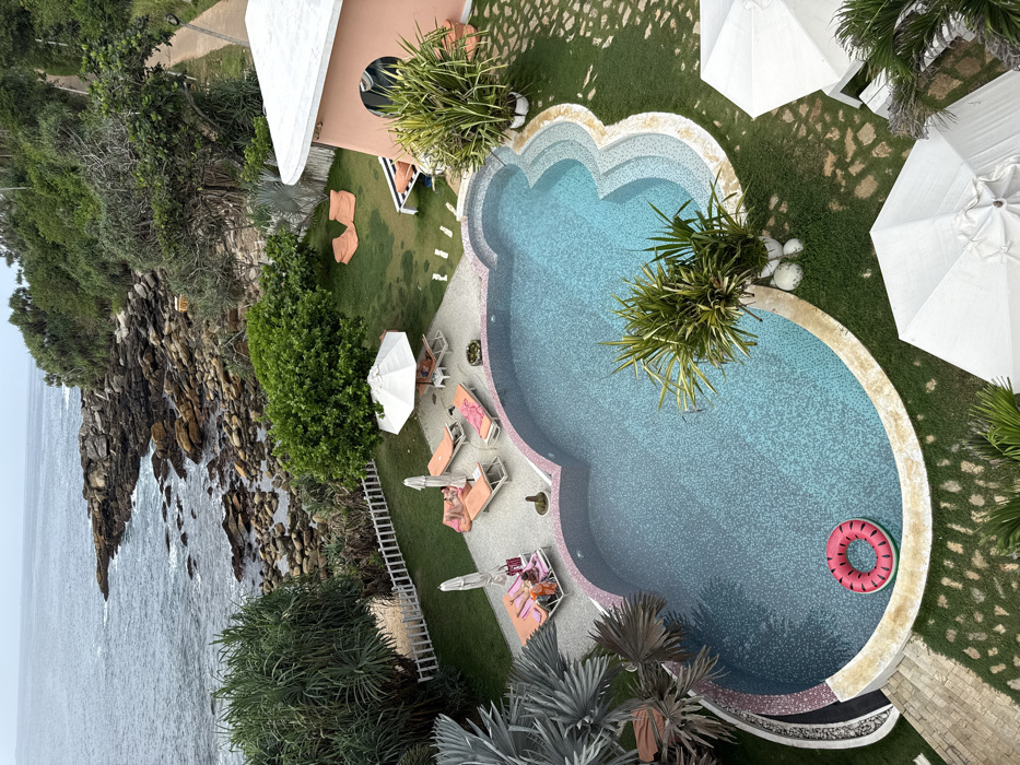 An overhead shot captures a coastal luxury resort. A uniquely-shaped, mosaic-tiled pool is surrounded by lounge chairs and umbrellas, bordered by manicured grass and tropical plants. To the left, a rocky shoreline meets the ocean. A building with a rounded, pink exterior stands near the pool, creating a blend of natural beauty and upscale design. A red inflatable ring floats in the pool.
