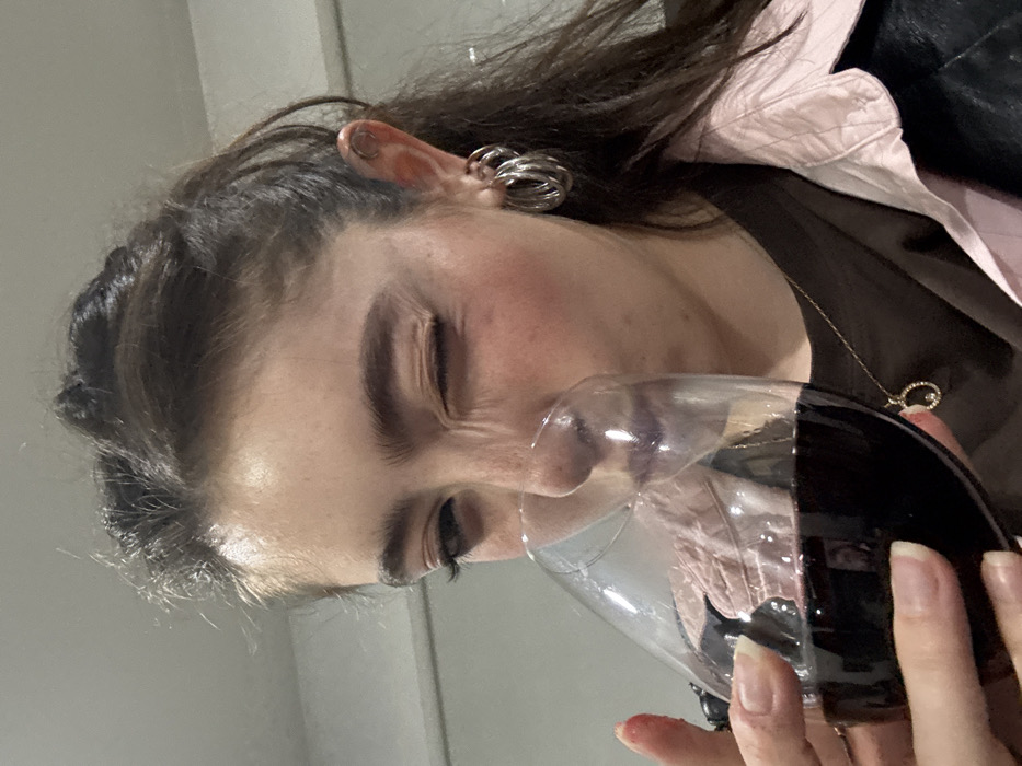 A woman is shown in a tilted, close-up shot, holding a wine glass to her lips