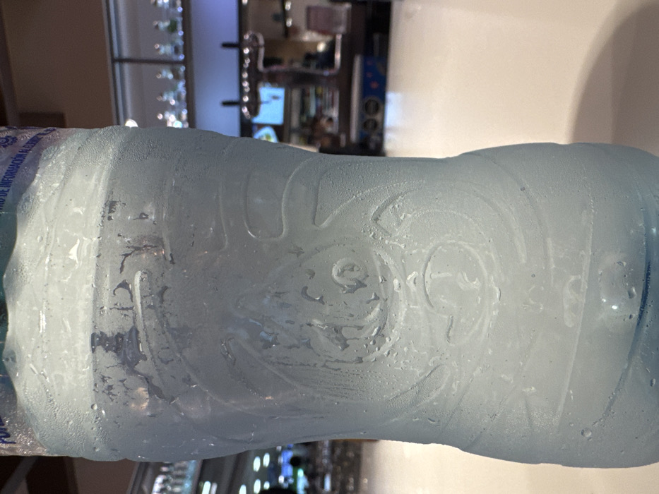 - "A cold, translucent plastic water bottle, heavily coated in condensation, occupies the foreground, resting on a light-colored, reflective countertop" by FM-BS4Ql2, licensed under CC BY 4.0
