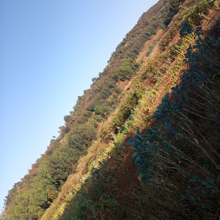 The scene depicts a steeply sloped agricultural and natural landscape in Ndeiya, Kenya. The upper left portion of the frame shows a clear, light blue sky. The majority of the image is occupied by a significant hillside. In the foreground and lower right, distinct rows of cultivated plants are visible, primarily consisting of tall, dark green, broad-leaved crops consistent with kale or collard greens, growing from reddish-brown soil. Further up the incline, additional rows of lighter green vegetation are present. The mid-ground and background are densely covered with natural trees and shrubs, forming a continuous expanse of varying shades of green and brown foliage extending towards the crest of the hill. The scene is illuminated by natural daylight. No individuals, animals, or artificial structures are discernible within the frame.