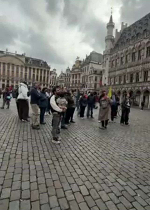 cobblestone square filled with people, seemingly tourists, standing and looking towards the architecture surrounding the square. The architecture includes ornate buildings with spires and detailed facades. The weather appears overcast with a cloudy sky. Some people are taking photos, and one person is holding a small child. The scene suggests a tourist gathering at a historic landmark or square in a European city.