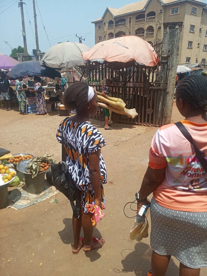 This image depicts an outdoor market scene in Nsugbe, Nigeria, under a clear, bright sky. In the immediate foreground, a woman faces away from the camera, displaying her right profile. She wears a white headband, a short-sleeved top with a black, white, and orange geometric pattern, and light-colored flip-flops. A black shoulder bag hangs from her left, and she holds a folded red and yellow patterned cloth in her right hand. To her left, two metal basins on the unpaved ground contain yellow spherical fruits and reddish-brown spherical fruits with green leafy branches. Adjacent to her right, a second individual is partially visible from the back, wearing an orange short-sleeved t-shirt with partial text "Specially for... Woman" and a grey patterned skirt. This person holds light-colored material and a wrist-worn device with an attached white component in their left hand. In the mid-ground, a person in a light green shirt is seen holding a light-colored, legless mannequin torso near a tall, dark metal gate. Several open market umbrellas in dark blue, light grey, and peach provide shade over various stalls. Individuals are visible under these umbrellas, with one stall displaying a blue sign with "POS" text. Utility poles are present on the left side of the frame. The background features a multi-story building with a light brown facade, multiple balconies, and a dark roof. The ground throughout the scene is unpaved and light brown.