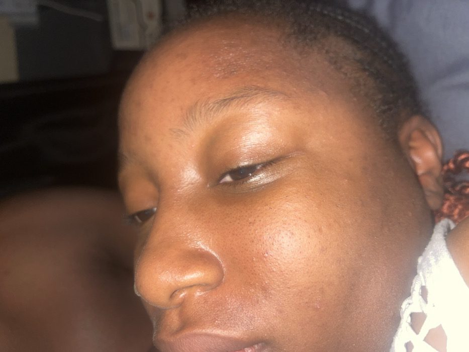 A close-up, oblique forensic image depicts the right side of an individual's face, with the head tilted towards the viewer's right. The subject exhibits a dark skin tone, dark eyes that are partially open, and dark eyebrows. Short, dark hair is visible along the side of the head, and fine pores are discernible on the skin of the nose, cheek, and forehead. The individual is positioned against a dark fabric surface, with a segment of a white, open-weave or crocheted garment visible in the lower left foreground. The background is indistinct, blurred, and dimly lit, consistent with an indoor environment. This scene is located in Rafin Par, Nigeria.