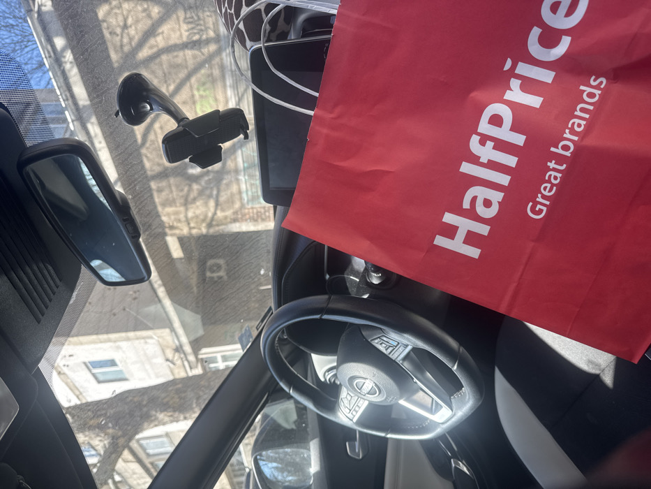 The image displays an interior view from a stationary, left-hand drive vehicle on a sunny day. A red "HalfPrice Great brands" shopping bag is prominently positioned in the lower right foreground, resting on the dashboard and partially obscuring the passenger seat. To the left, a black Nissan steering wheel with integrated controls is visible. The dashboard includes a central display screen. A black phone mount with a suction cup is affixed to the upper right portion of the windshield, and a rearview mirror is mounted centrally at the top of the windshield. The windshield itself shows evidence of dust or smudges. Through the windshield, an urban street scene is visible. The background consists of multi-story buildings with various windows, constructed from light-colored concrete or stucco, consistent with older European architecture. Bare deciduous trees stand in front of these structures, casting distinct shadows onto the buildings and street. Part of another vehicle is faintly visible in reflection or through the windshield on the left side. The sky appears clear and bright. While the precise street location within Ruse, Bulgaria, cannot be definitively determined from the visual cues, the presence of the "HalfPrice" shopping bag indicates the user's recent visit to or proximity to a HalfPrice retail location, a chain known to operate in Ruse. No individuals are visible within the frame.