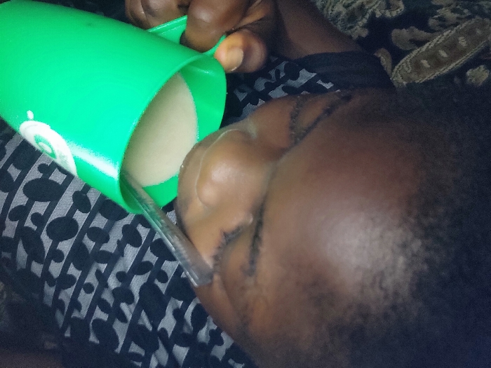 An extreme close-up depicts an individual consuming a beverage indoors. The subject, of indeterminate age and gender with dark skin, is positioned with their head tilted downwards, drinking from a bright green plastic mug via a silver-colored metallic straw. The right hand, with dark skin, grips the mug's handle. The mug contains a light beige-colored liquid, approximately two-thirds full, and displays a partial white circular logo on its side. The individual wears a garment featuring a black background with repeating light grey or white stylized U-shaped patterns. The background consists of dark, ornately patterned fabric, likely upholstery. The scene is an indoor setting in Unknown, Unknown.